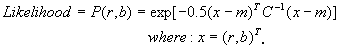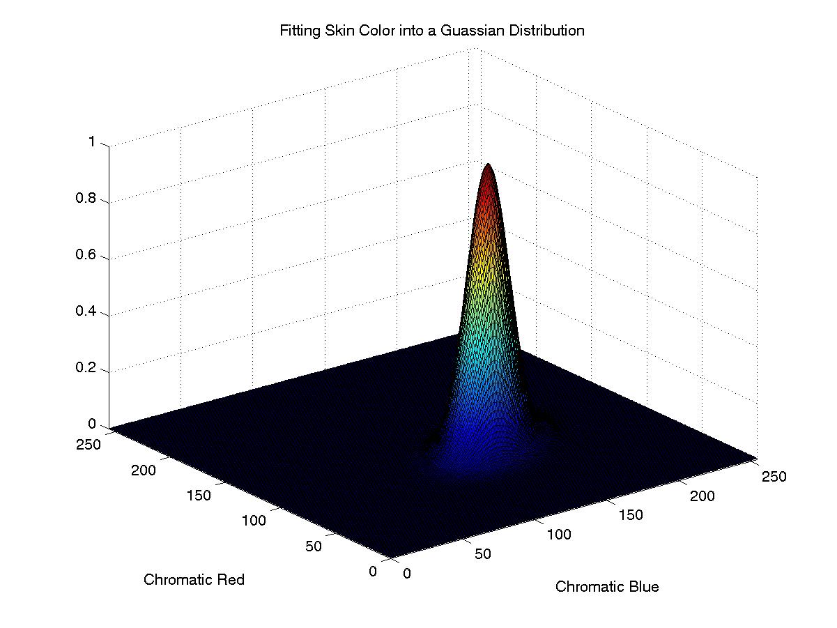 With this Gaussian fitted skin color model, we can now obtain the likelihood of skin for any pixel of an image. Therefore, if a pixel, having transform from RGB color space to chromatic color space, has a chromatic pair value of (r,b), the likelihood of skin for this pixel can then be computed as follows: