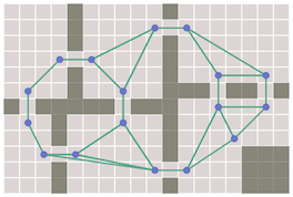 To improve on path smoothing, we need to take into account the any-angle line segment lengths during pathfinding. The Theta* algorithm[26] does this. When building parent pointers, it will point directly to an ancestor if there’s a line of sight to that node, and skip the nodes in between. It produces shorter paths than path smoothing. However, Theta* does not guarantee shortest paths. The original paper[27] has the details. Lazy Theta*[28] is a variant that has fewer line of sight checks.