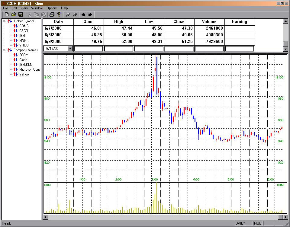 K-Line is a Window program I wrote using VC++ in MFC. It can download/update any stock's daily pricing information from the internet and display the price in a graphical interface. Alternatively, the data can be entered manually from an intuitive spreadsheet-like interface. I'm currently looking to extend this program in two directions. First of all, I would like to add the capability to display and store stock's fundamental data in addition to the pricing data. Those fundamental data include P/E ratio, book value, revenue, sales, dividends, etc... Secondly, I would like to add some algorithmic technique to filter the stocks and pick potential winners. I've been exploring techniques in neural networks. If you have any information about a server containing free downloadable fundamental data or about technique on picking stocks and would like to share with me, please contact me. Thanks.