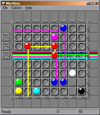 Mystery Box is a Windows game I wrote a while ago using VC++ in MFC. It's based on the classic game called Black Box. Unlike Black Box game, this game support multiple colors of marbles. At the start of the game, a fixed number of colored marbles are randomly hidden in different locations on the board. The purpose of the game, of course, is to correctly guess the locations of the marbles in the center squares black box with as few physical light beam probes as possible. The light beam consists of 6 colors: blue, red, green, yellow, purple, cyan. Different colored marbles have different properties. Different colored marbles has different fixed properties for different colored light. Each colored light can either be deflected, transmitted, or absorbed. For example, red marble absorbs red light and deflects blue and green lights. Black marble absorbs all colors. The control for the game is very intuitive. Toggle the marbles in the center squares by pressing either the left or right mouse button to place the marbles. On the outside squares, press the right button to shoot out a virtual beam of light which is used to test the expected light ray deflection with the current placement of the marbles. Press the left button to shoot out a physical beam of light. Let me know if you have any comment so I can improve the program. Thanks.