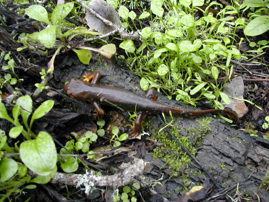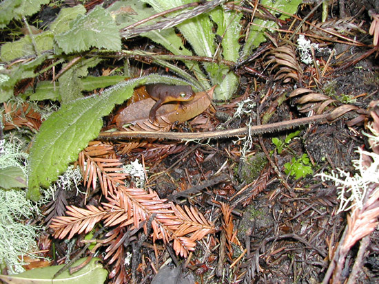 A small salamander peeking out from under some leaves.