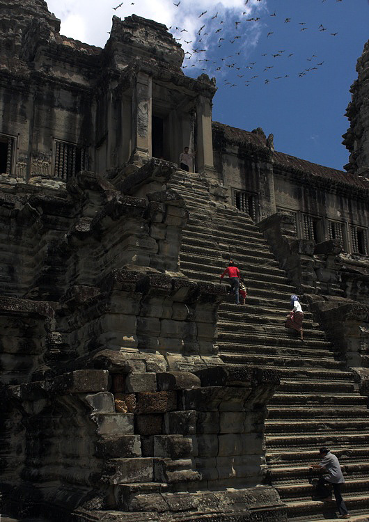 Birds circling above locals climbing up the steep stairway to the third level of Angkor Wat.