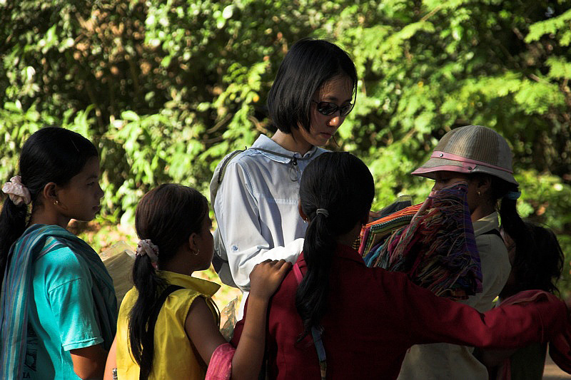 Serene swarmed by scarf vendors outside Preah Ko.