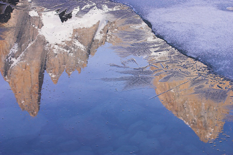 Icy reflection of Poincenot and Fitzroy on Laguna de los Tres.