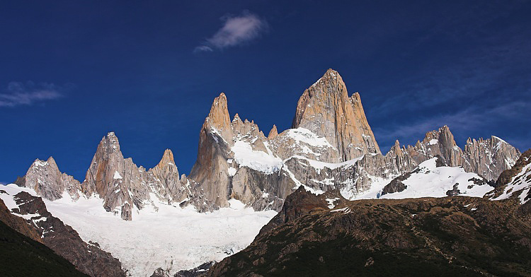 From left: Aguja de la S (2335 m), Saint Exupery (2558 m), Rafael (2482 m), Poincenot (3002 m), De la Silla (2938 m), Fitzroy (3405 m), Mermoz (2732 m), Guillaumet (2579 m)