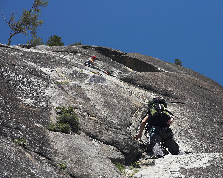 Danielle heading up the third pitch of the Nutcracker while belayed by Matt in the background.