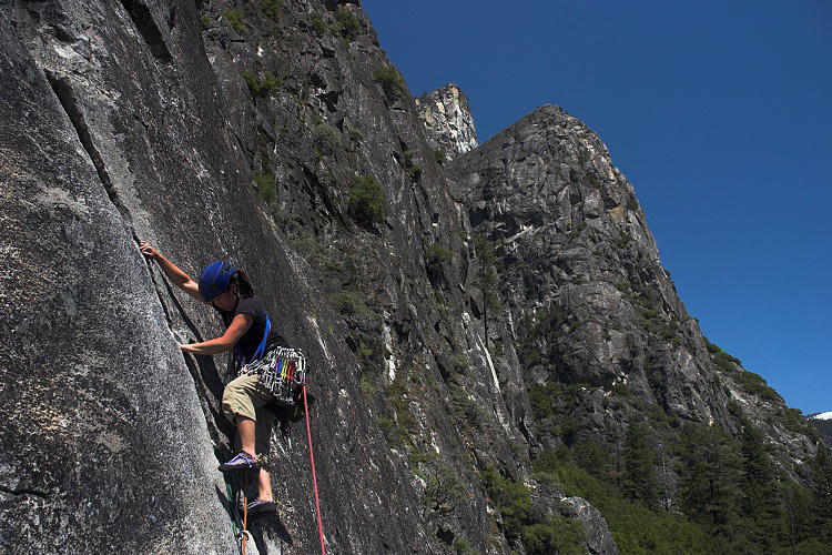 Chris heading up the crack with the granite walls of Yosemite valley in the background.