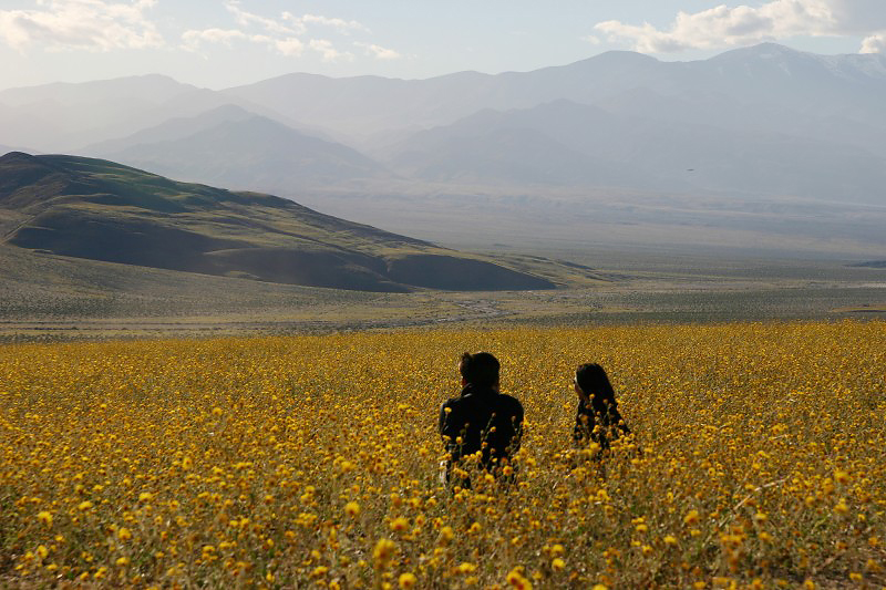 Serene and I crouching among the desert gold wildflowers. Taken by Nancy.