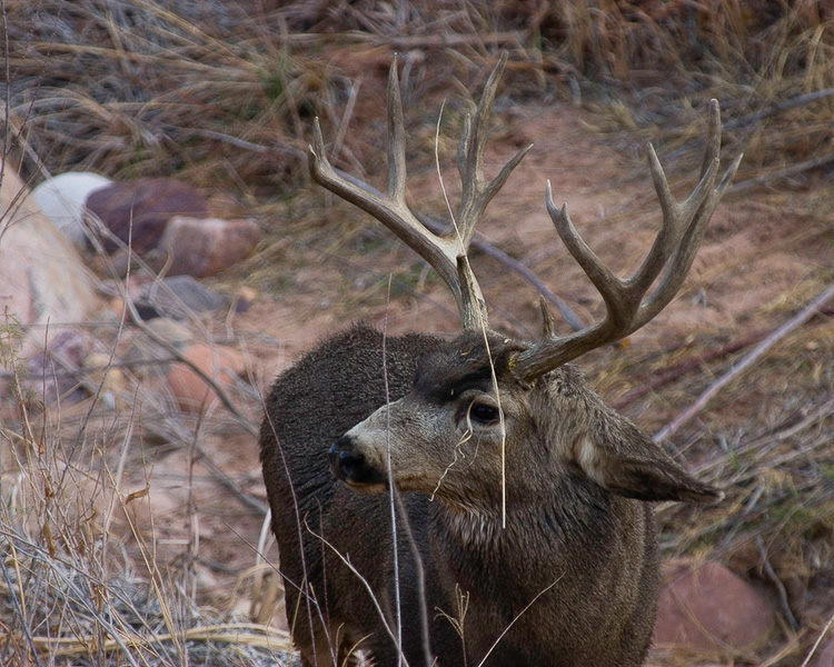 Older deer staring up at the younger deer. He was tossing some hay around, which explains the bits of straw stuck on his face.
