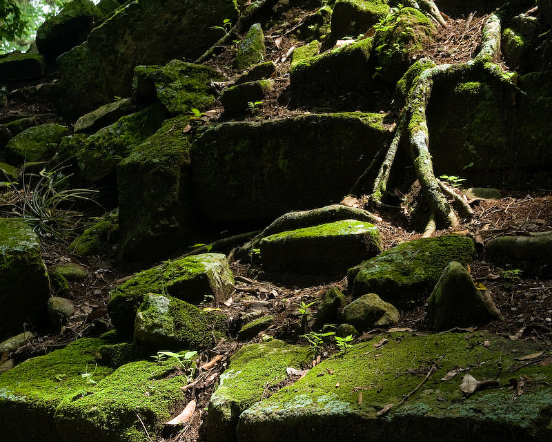Dappled sunlight on lichen covered stones.