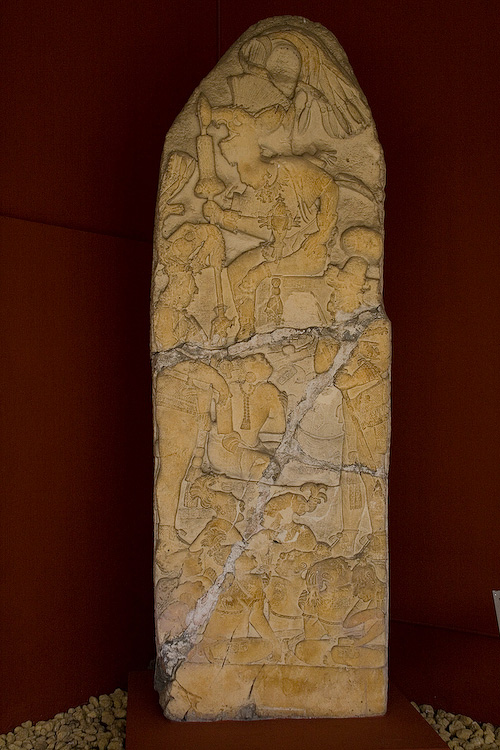 Stela 12 (672 AD) from Piedras Negras depicting a cowering captive king begging for mercy.
