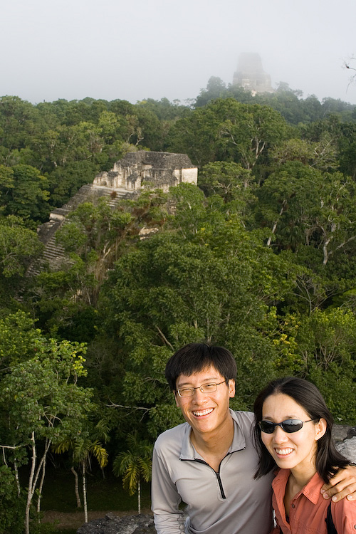 Serene and me at the top of the pyramid. Shrouded in fog behind us is Temple IV.