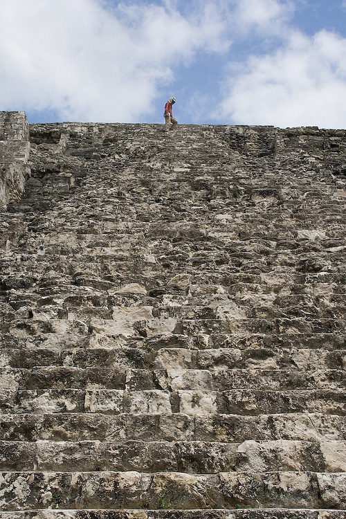 Serene descending from the tallest pyramid in the East Acropolis in Yaxha.
