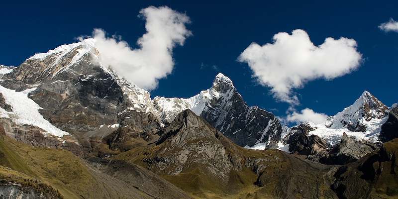 Yerupaja Chico (6089 m), Jirishanca (6094 m), Rondoy (5870 m) from the eastern end of Laguna Carhuacocha.
