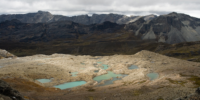 Small lakes to the east of the 5050 m pass south of Trapecio Punta with the Cordillera Raura in the background.