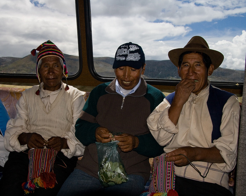 Taquile locals chewing coca leaves.