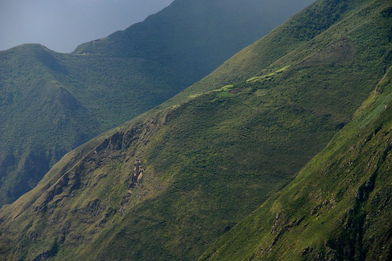 The trail to Choquequirao that we will be ascending the next day on the opposite side of the valley. If you look closely on the top left, you can see gray buildings that are part of Choquequirao.