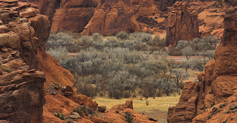 Green Cottonwoods beckon past the red canyon walls, Canyon de Chelley.