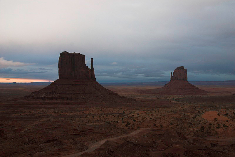 The Mittens during an overcast sunset, Monument Valley.