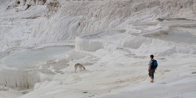 Eu-Jin and dog on the travertine shelves, Pamukkale; taken by Serene
