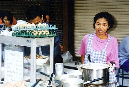 Eating jook in a morning market, Bangkok