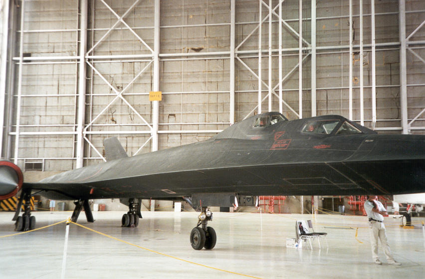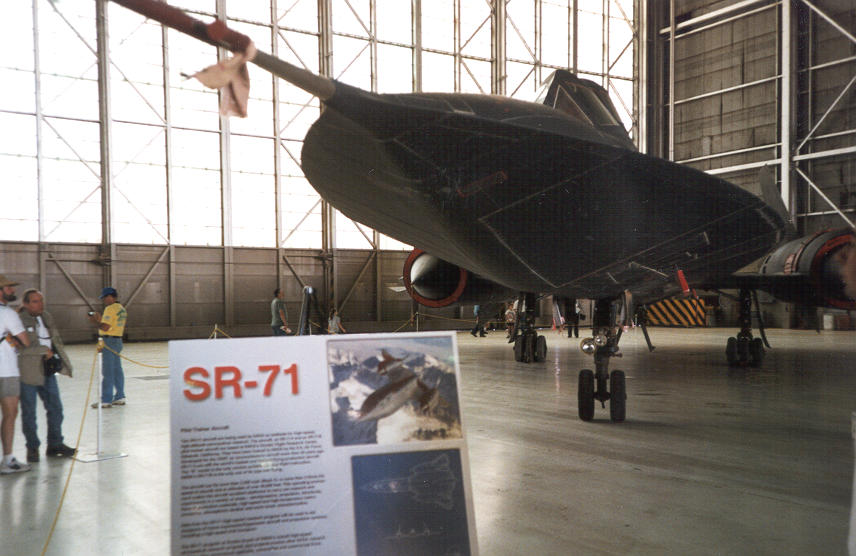++ Inside the hangar, a front view of the SR71 blackbird. Its shape is so unusual, it's hard to describe what it feels like to stand next to it... |