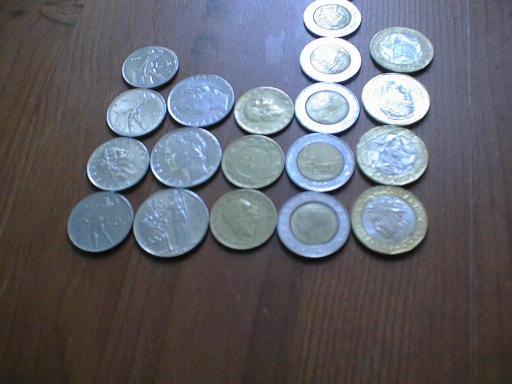 Italian coins: 50, 100, 200, 500, 1000 Lire.