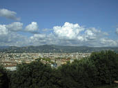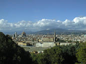 Looking northwest, the clock tower from the Palazzo Vecchio (1200s) and Brunelleschi's dome atop the Duomo cathedral (1400s) rise above the city skyline.