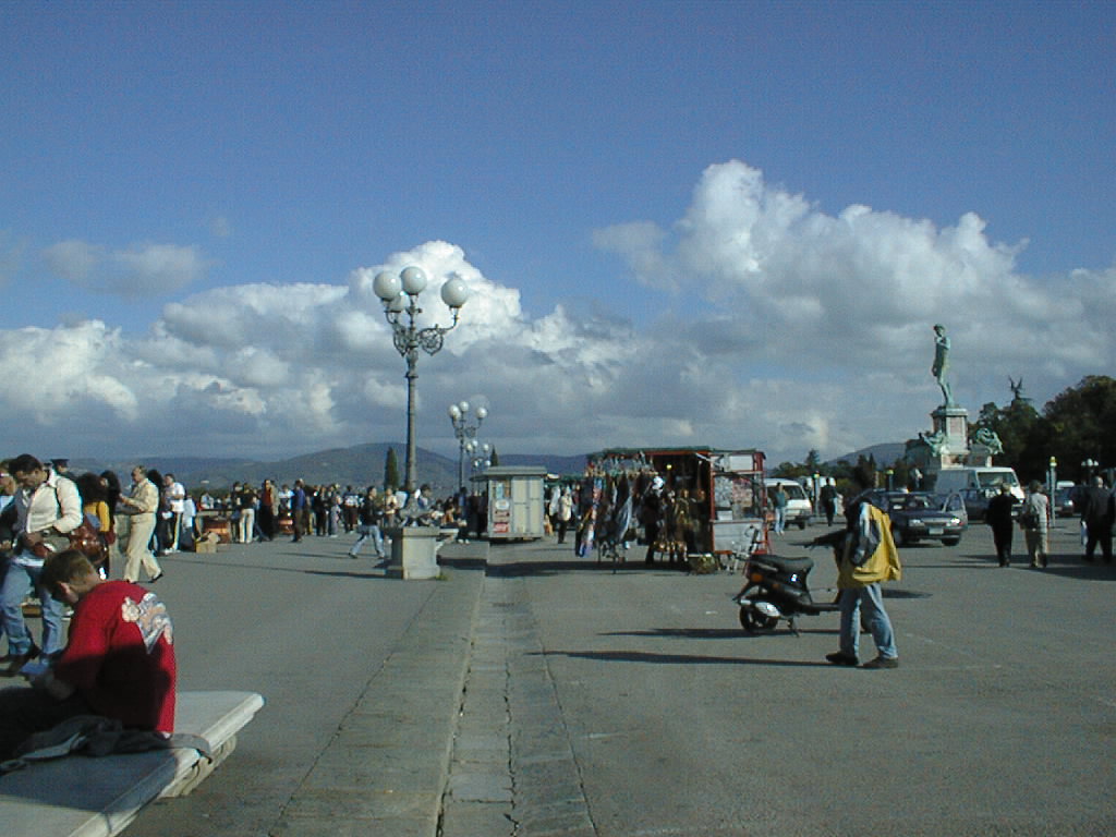 At the top is the piazza, filled with tourists, vendors, and a bronze replica of Michelangelo's David.