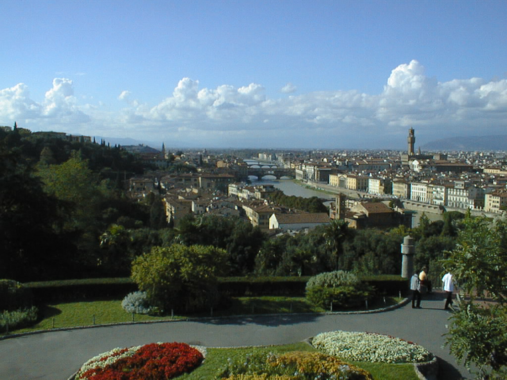 The view west, down the Arno. The three bridges are the Ponte Vecchio, Ponte Santa Trinita, and Ponte Alla Carraia.