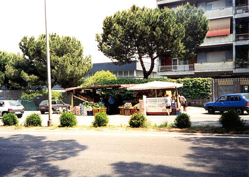 ++ Common in Rome was the roadside fruit stand, which often sold greasy tourist food like bad pizza and doughnuts. |