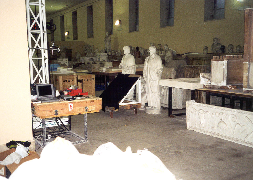 ++ Our schedule was wildly overambitious, meaning that we were soon scanning with two scanners, 24 hours a day. We usually had 3 people in Rome at a time, which meant that we each worked 16 hour shifts, with 8 hours off to sleep and eat. Here the exhaustion starts to show on Dave's face. |