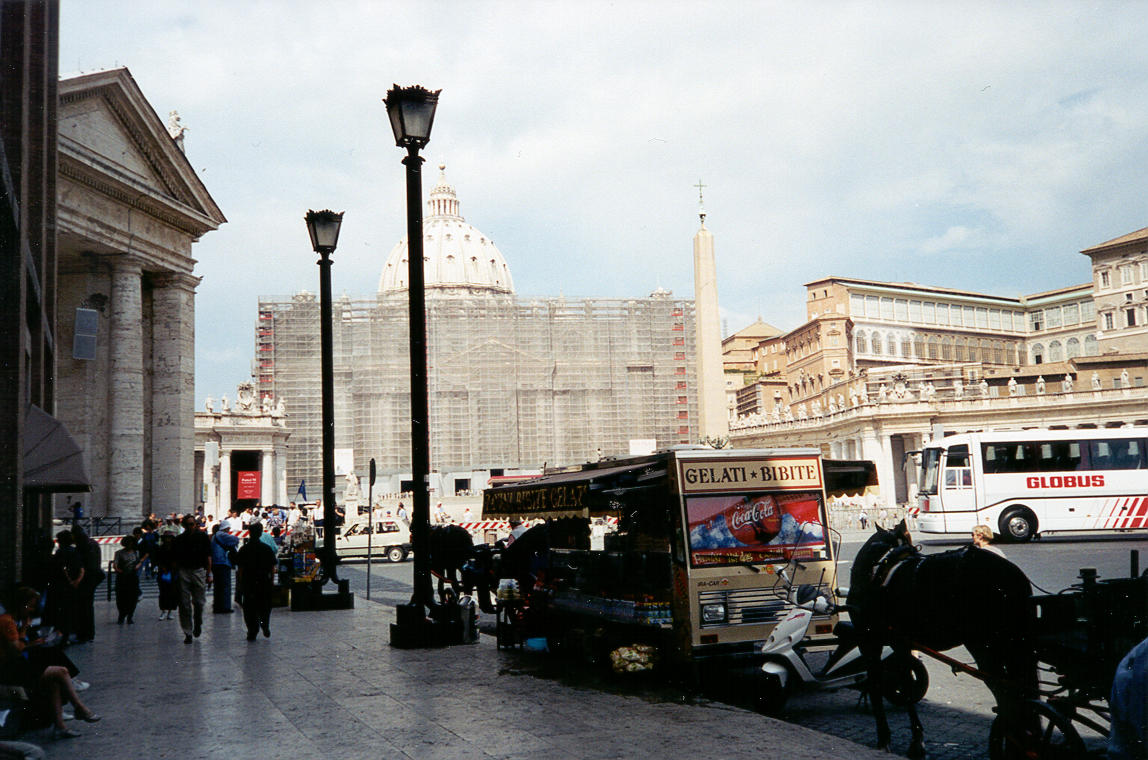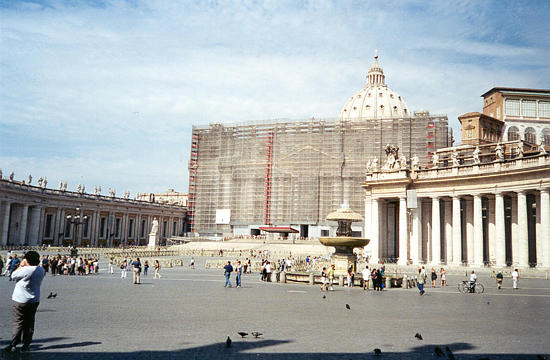 ++ Walking from the Metro, St. Peter's Basilica finally appears beyond the cafes, souvenir shops, and gelato trucks. Alas, in preparation for the year 2000 Jubilee, the entire edifice was under restoration. |
