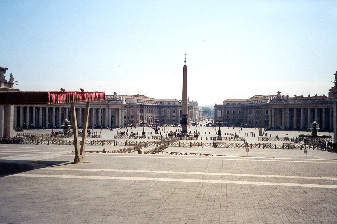 ++ Approaching the entrance to St. Peters, you pass the clothing police (The guy in the dark suit with his back turned). The clothing police stood on the steps, turning back any women who dared attempt to enter St. Peters in shorts. Out in the piazza, many vendors did good business selling wrap-around skirts... |