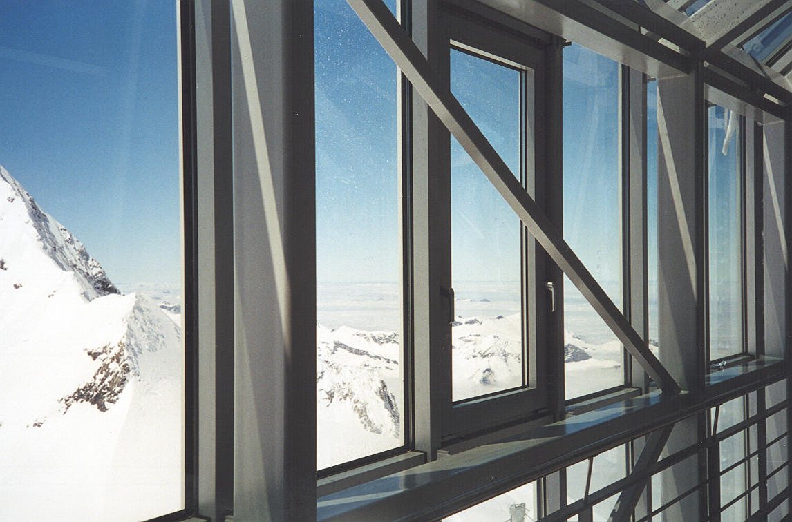 ++ Jungfraujoch station. Here we are standing outside on the glacier, at train station level. The observation deck sits high atop this rock spire. You can see part of it on the left. An elevator climbs up from the station to the observatory in a mere 25 seconds, reaching speeds of 15 mph. |