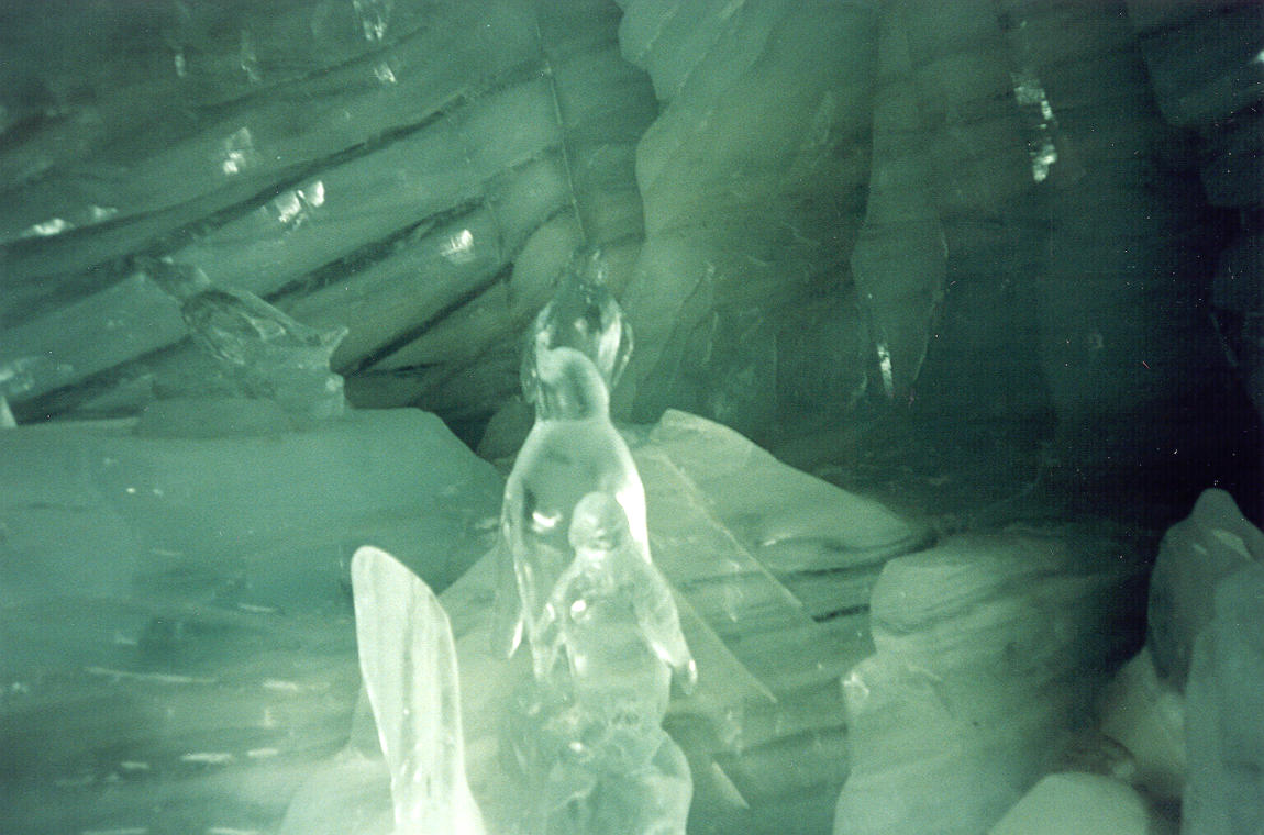 ++ It features a number of ice sculptures, such as these penguins. Notice in the background, how you can see the strata of ice. |