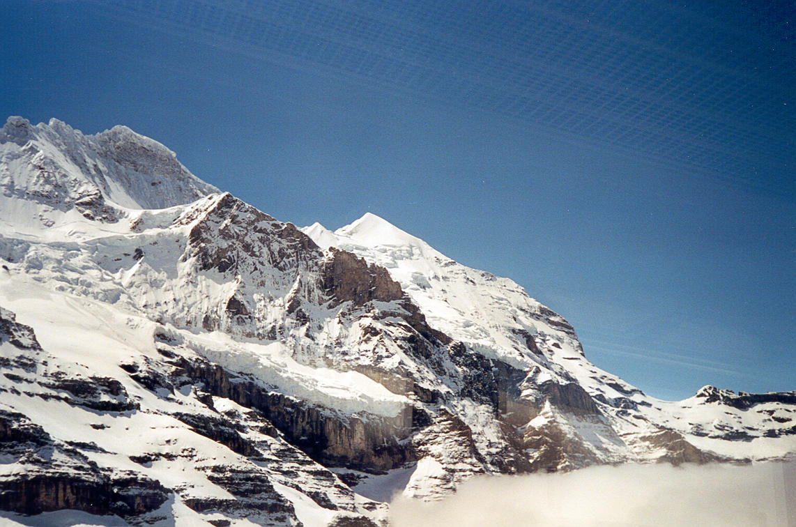 ++ Here's the view from the first station, just slightly above cloud level. Notice the snow piling up against the window on the right and bottom. The window is just flush with the face of the mountain. |
