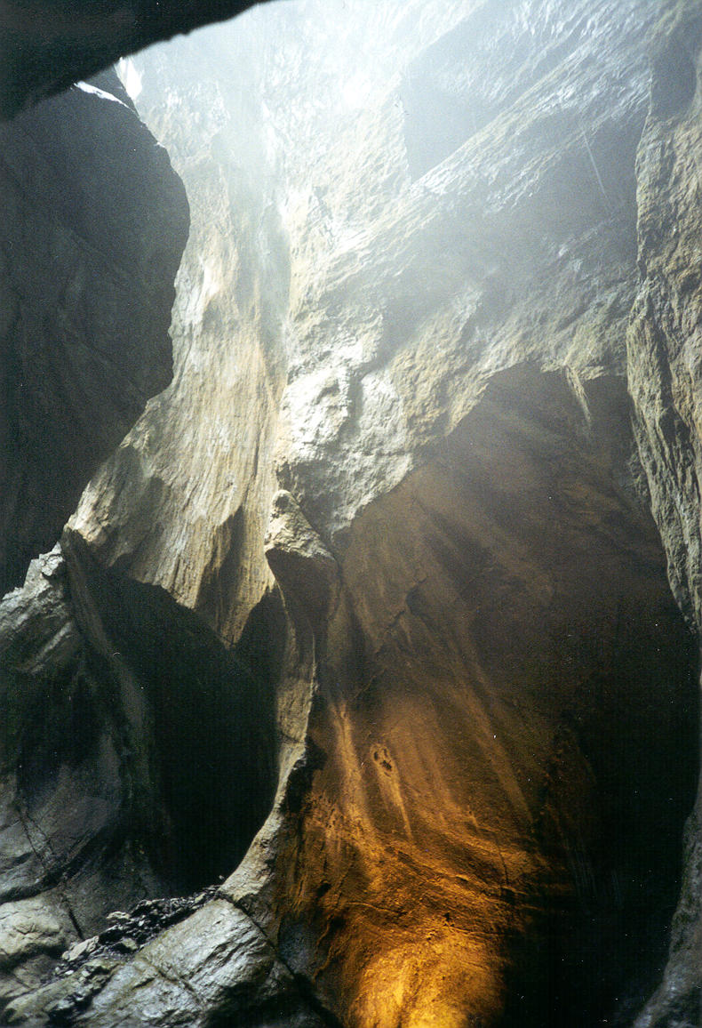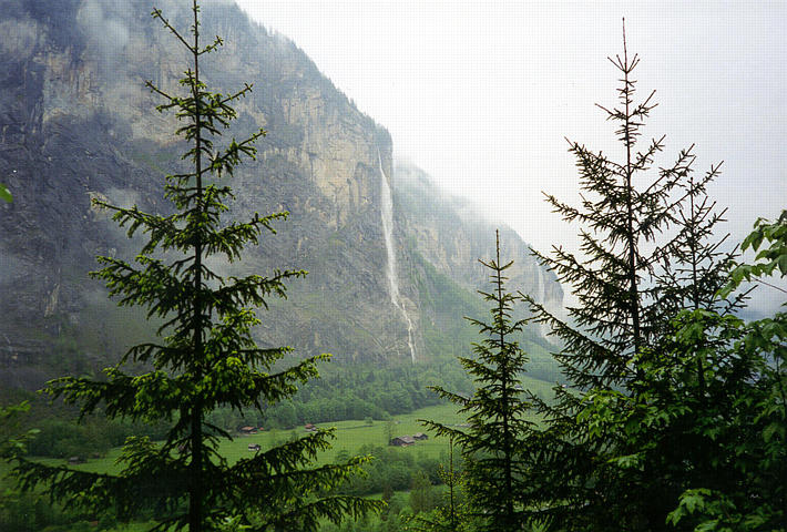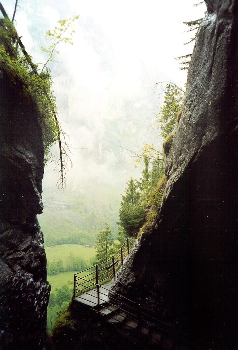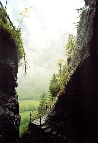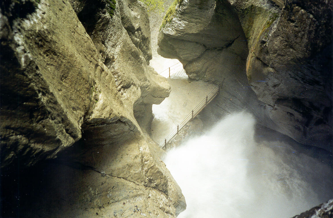 Trummelbach. 10 glacier-waterfalls inside the mountain made accessible by tunnel-lift and illuminated. The Trummelbach alone drains the mighty glacier defiles of Eiger (3970 m), Monk (4099 m) and Jungfrau (4158 m) and carries 20.200 tons of boulder detritus per year. Its drainage area is 24 km2, half of it covered by snow and glaciers. Up to 20.000 litres of water per second. The only glacier-waterfalls in Europe inside the mountain and still accessible.