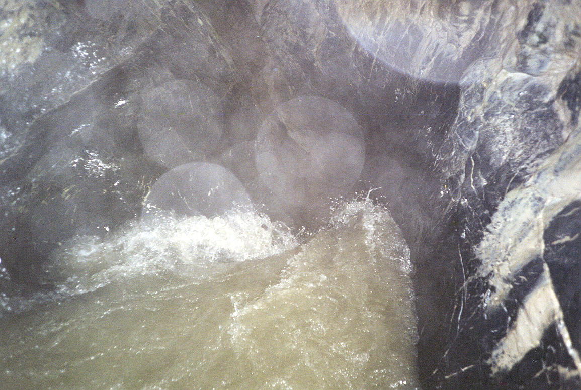The water disappears down a hole. Mist droplets close to the camera reflect the flash, causing white circles.