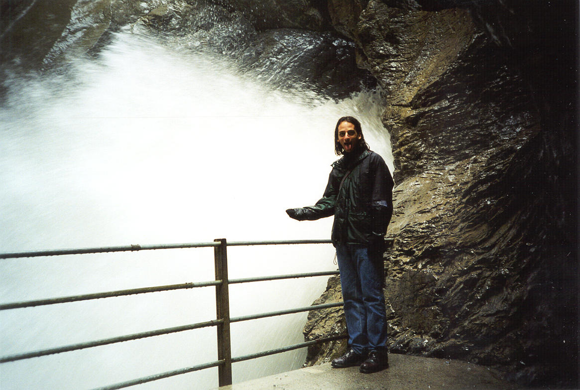 Jonathan, getting drenched by the rivulets of water cascading down the valley wall.